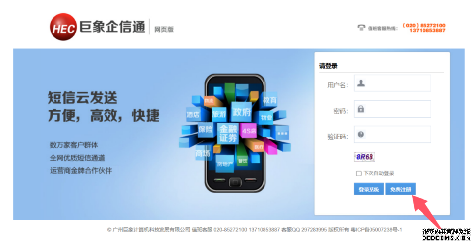用電腦或手機(jī)登錄短信平臺(tái)軟件首頁(yè)https://sms.hechina.cn點(diǎn)擊免費(fèi)注冊(cè) ,如下圖所示。用戶名可以是手機(jī)號(hào)碼、公司簡(jiǎn)稱的中文或拼音。